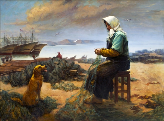 陈鹏翔油画作品《织网女人与狗》 110x150cm